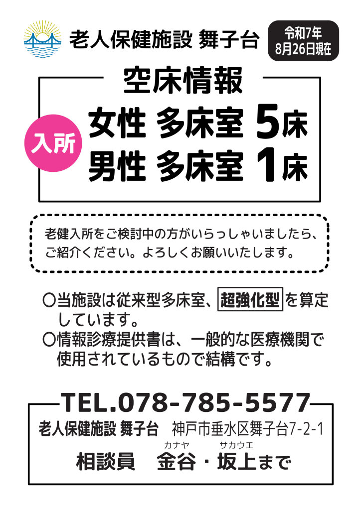 老人保健施設 舞子台は病院での治療を済ませ、症状は安定しているが家庭での日常生活を過ごすにはまだ、看護・介護・リハビリテーションが必要な高齢者などの方々に対し、ケアプランに基づいたサービスを提供しております。当施設では、利用者さまに安心してサービスを受けていただくため、すべての職員が向上心と問題意識を持ち、より良い看護・介護・リハビリテーションを目指しております。